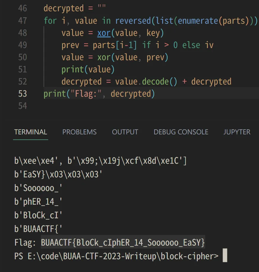 parts = [b'\x85^}\t\xad\xec\x81,', b'\xba\x04W\xa1\xee"\xea\xc5', b'\xb7ZW\x18\x99\x82\xd6:', b'\x99\x03}\x9c\xde|\xb1\xc5', b'\xa1Tk.\x8b\xee\xbaf']decrypted = ""for i, value in reversed(list(enumerate(parts))): value = xor(value, key) prev = parts[i-1] if i > 0 else iv value = xor(value, prev) print(value) decrypted = value.decode() + decryptedprint("Flag:", decrypted)